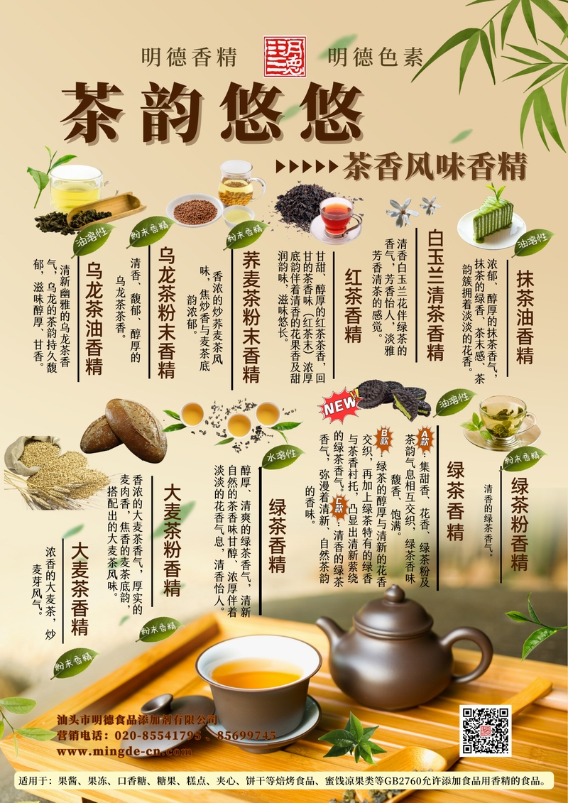 汕頭市明德食品添加劑有限公司推出的茶香風(fēng)味系列香精,涵蓋烏龍茶、蕎麥茶、紅茶、白玉蘭清茶、抹茶、大麥茶、綠茶等多種茶類(lèi)調(diào)性,滿足飲品、烘焙、糖果、乳制品、調(diào)味品等多領(lǐng)域的茶香需求,為B端客戶提供穩(wěn)定、真實(shí)的茶韻香氣解決方案。