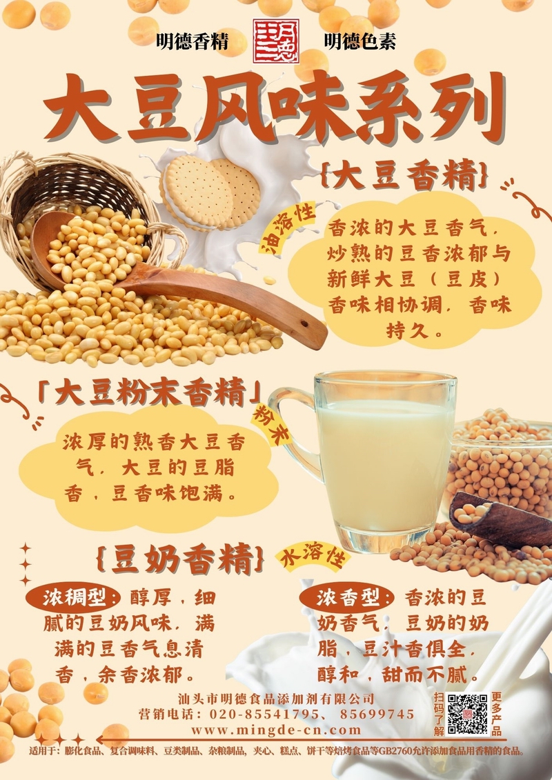 如需獲取不同版本風味樣品或配方方案,歡迎聯(lián)系明德團隊。我們致力于為食品工廠提供真實、安全、高性價比的香精解決方案。汕頭市明德食品添加劑有限公司推出的大豆風味系列香精,覆蓋大豆香精、大豆粉末香精、豆奶香精等多種調性,風味真實,留香穩(wěn)定,適用于膨化休閑、復合調味、豆制品及飲料等B端工廠,幫助快速打造具有記憶點的大豆類風味。