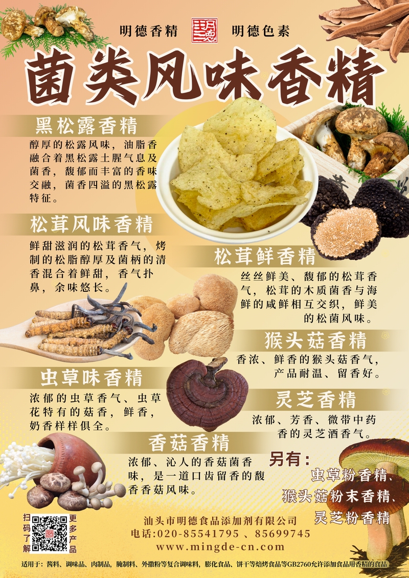 汕頭市明德食品添加劑有限公司的菌類風味香精系列,涵蓋黑松露、松茸、蟲草、猴頭菇、靈芝、香菇等多種風味,并配有粉末型產(chǎn)品。產(chǎn)品菌香真實、留香持久、層次豐富,適用于湯料包、醬料、調(diào)味品、肉制品、腌制料及外撒粉、復合調(diào)味料,膨化食品、餅干等焙烤食品等B端應用,幫助工廠打造具有辨識度的菌類風味產(chǎn)品。