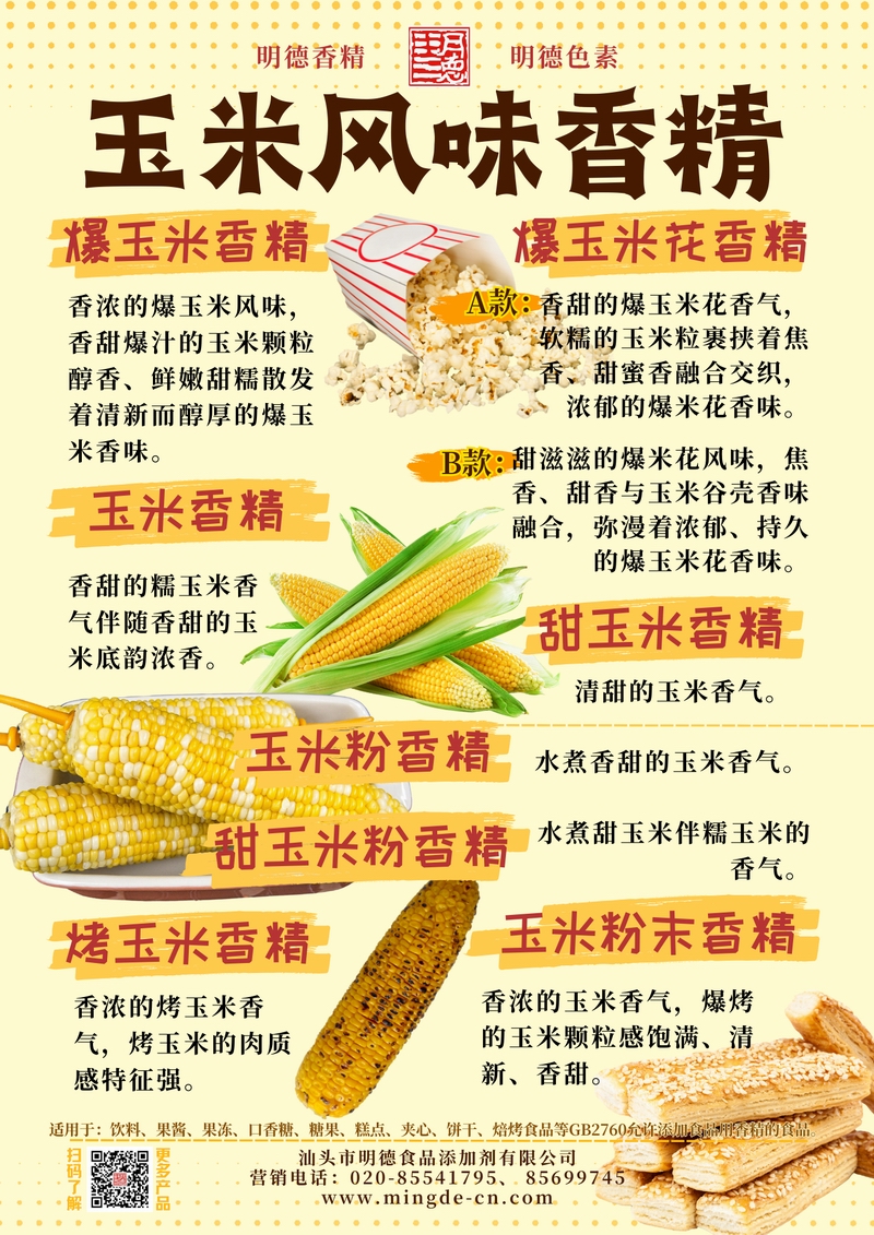 汕頭市明德食品添加劑有限公司推出的玉米風味香精系列,覆蓋爆玉米、爆玉米花、烤玉米、糯玉米、甜玉米及粉末型等多種調(diào)性。產(chǎn)品風味真實、留香穩(wěn)定,適用于飲品、烘焙、休閑零食、糖果及復合調(diào)味等B端應(yīng)用,幫助工廠快速打造具有記憶點的玉米風味。